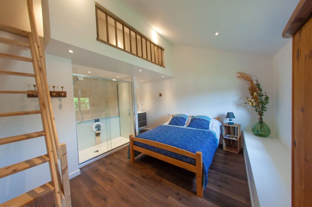- Une chambre avec lit de 140x190cm avec salle de bain attenante dotée d’un sèche serviette, sèche-cheveux et une mezzanine avec un matelas de 140*190cm.