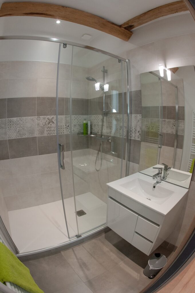 Salle de bain 2 : douche à l’italienne, lavabo, sèche-cheveux, sèche serviette