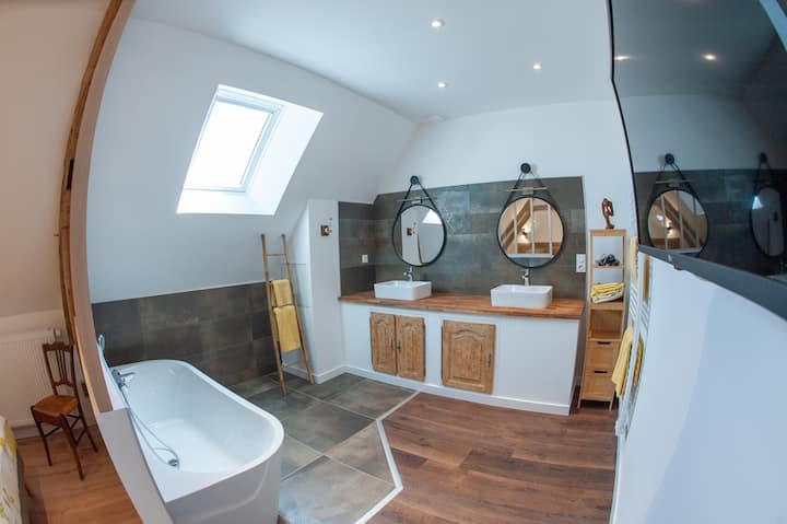 Salle de bain 4 : baignoire, double vasque, sèche serviette, sèche-cheveux