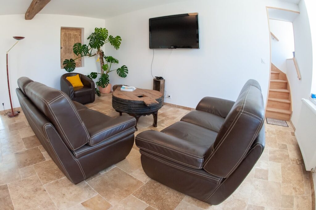 - Une grande pièce à vivre dont la salle à manger dotée d’un insert (bois fourni) et le salon équipé de deux canapés, d’un fauteuil et d’un téléviseur grand écran.