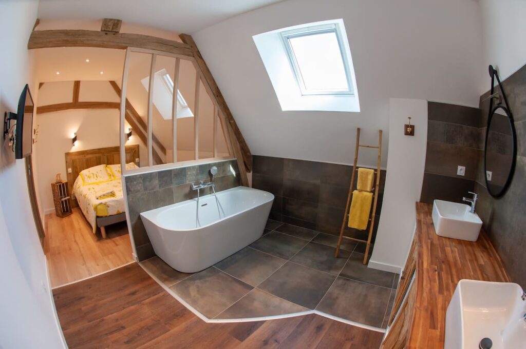 - Une quatrième chambre : la suite parentale de 25m² avec un lit de 160*190cm, une salle de bain attenante avec baignoire, un meuble double vasque, un téléviseur.